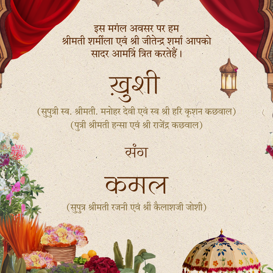 Celebrate your special day with this stunning Banna Banni wedding invite that beautifully blends traditional Marwadi charm with contemporary flair. Featuring vibrant designs inspired by classic banna banni customs, this Hindi-language invitation captures the joy and grandeur of your wedding festivities. Perfect for couples who want to honor their heritage while adding a modern twist, this invite sets the perfect tone for an unforgettable celebration. Impress your guests with an invitation that tells your unique love story through the lens of timeless Marwadi traditions.